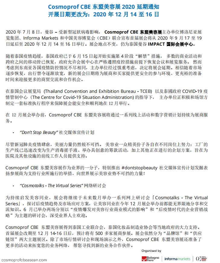 2020年7月8日,曼谷-受新型冠狀病毒影響,CosmoprofCBE東盟美容展主辦單位博洛尼亞展覽集團(tuán)、Informa Markets和中國美容博覽會(CBE) 聯(lián)合宣布首屆展會將從2020年9月17至19日延后至2020年12月14至16日舉行。展會地點(diǎn)不變,仍為泰國曼谷IMPACT國際會展中心。