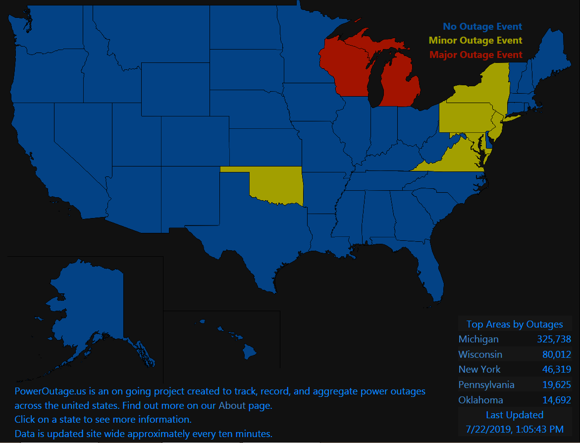 據(jù)美國(guó)“Power Outage”數(shù)據(jù)顯示,密歇根、威斯康辛和紐約州22日停電事故數(shù)量已經(jīng)有所下降