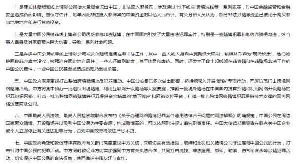 與此同時,中國駐菲律賓大使館在官網(wǎng)也列出菲律賓實體賭場和線上博彩公司對中方造成的一系列嚴重不利影響: