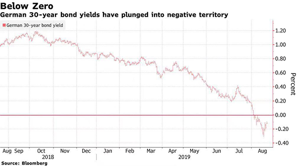 由于擔(dān)心全球經(jīng)濟(jì)疲弱以及預(yù)期歐洲央行將啟動(dòng)新一輪寬松政策,投資者紛紛買(mǎi)入歐元區(qū)的安全資產(chǎn)德國(guó)國(guó)債。德國(guó)30年期的現(xiàn)券收益率也在近期下降到了-0.2%附近,一年前這個(gè)數(shù)值還維持在1%附近。